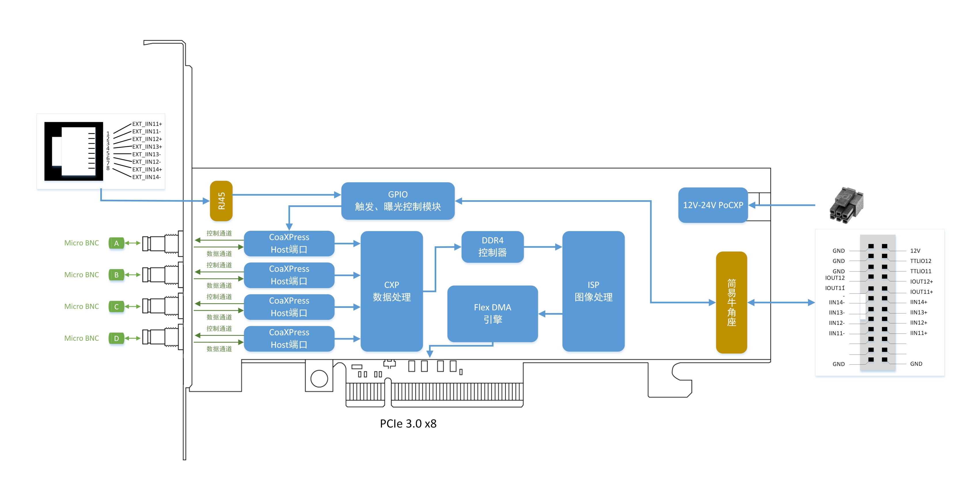 | CXP接口 | 4个75欧姆Micro-BNC接口,支持PoCXP,每个接口可提供13W供电。支持 1.25,2.5,3.125,5,6.25,10,12.5 Gbps速率。